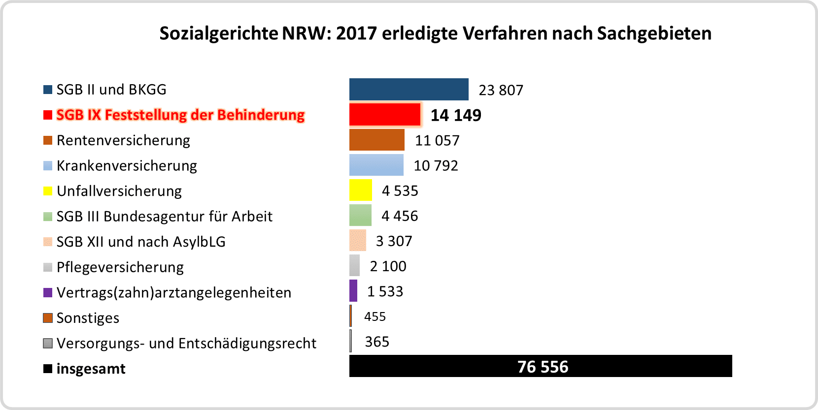 Anderes gilt und galt in Nordrhein-Westfalen. Sowohl 2013 als auch 2017 wies das Sachgebiet „Feststellung der Schwerbehinderung nach dem SGB IX“ – nach „SGB II/BKGG“ – die höchsten Eingangszahlen auf: