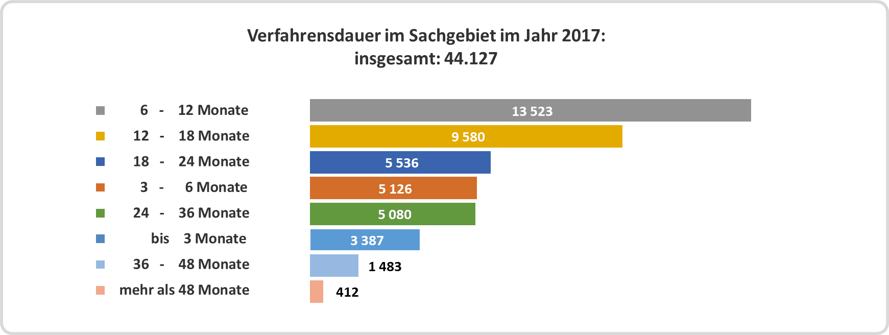 Die meisten Verfahren (13.523 = 31 % von 44.127) im Sachgebiet Feststellung der Schwerbehinderung nach dem SGB IX wurden 2017 nach 6 bis 12 Monaten erledigt. Mehr als die Hälfte der Verfahren (= 51 %) konnte innerhalb von 12 Monaten erledigt werden. Die durchschnittliche Dauer der Klageverfahren zum Schwerbehindertenrecht 2017 betrug 15,4 Monate.