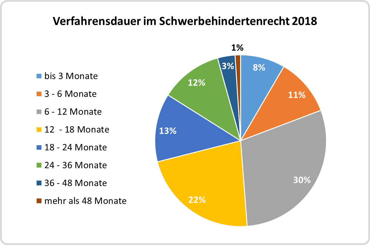 Die durchschnittliche Dauer der Klageverfahren zum Schwerbehindertenrecht im Jahr 2018 betrug 14,6 Monate. Insgesamt konnten 2018 41.485 Verfahren erledigt werden. Die Verfahrensdauer der durch Urteil erledigten Verfahren lag mit durchschnittlich 25,5 Monaten deutlich über dem Gesamtdurchschnitt; lediglich 2.695 Verfahren endeten durch Endurteil.