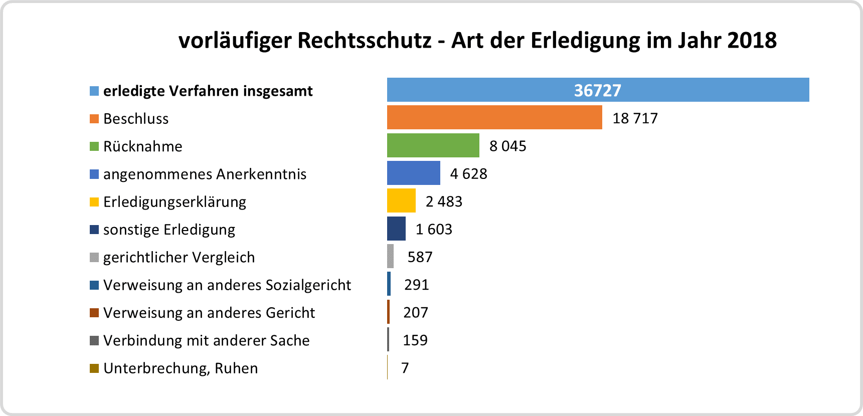 Für die im Jahr 2018 erledigten Verfahren beim vorläufigen Rechtsschutz ergibt sich die Art der Erledigung aus dem folgenden Balkendiagramm. Von den 36.727 Verfahren zum vorläufigen Rechtsschutz erledigten die Sozialgerichte 18.717 durch Beschluss: