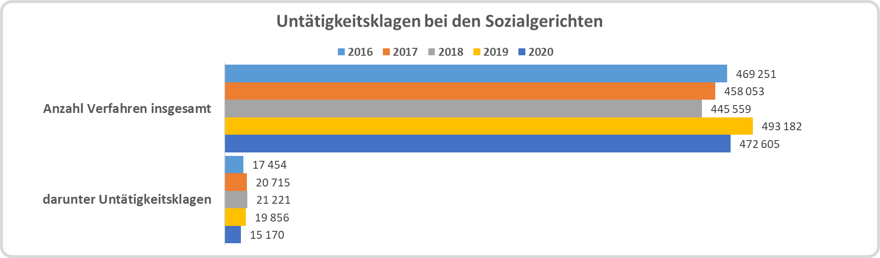 Anfang des Jahres 2020 waren bei den Sozialgerichten in der ersten Instanz 472.605 Verfahren anhängig (vgl. das folgende Diagramm und oben zu 1.). Im Laufe des Jahres 2020 kamen 309.650 Neuzugänge hinzu. Davon waren 15.170 Untätigkeitsklagen. Dies entspricht für das Jahr 2020 einem Anteil von ca. 4,8 % an den Neuzugängen.